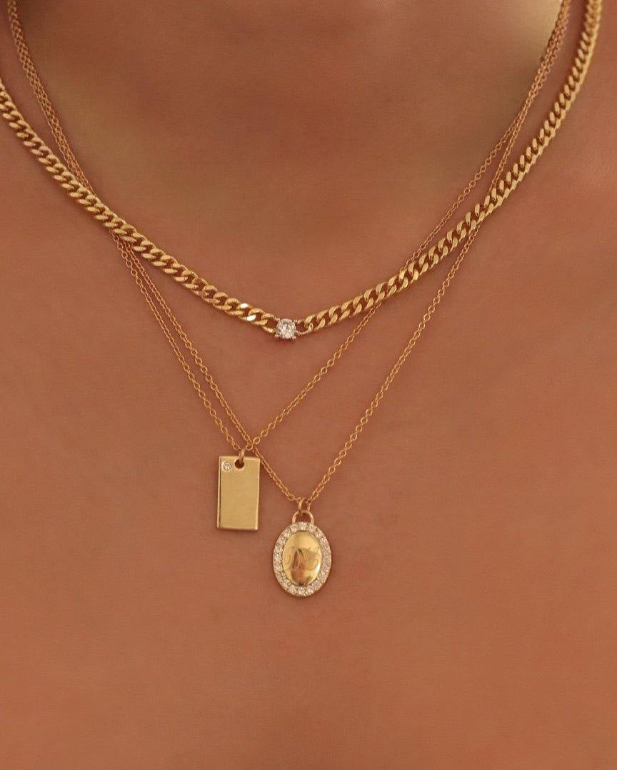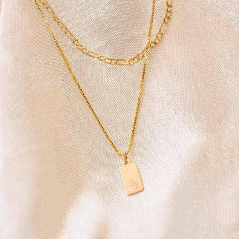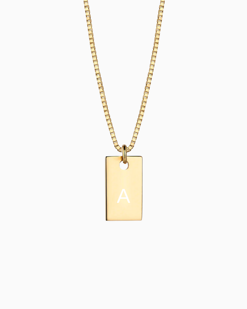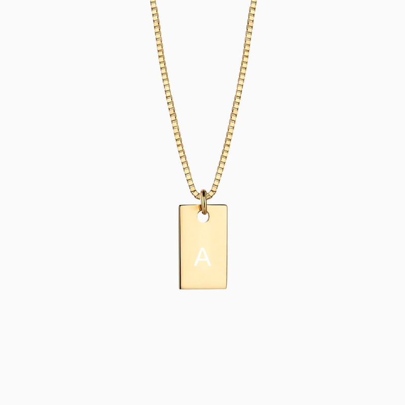 Our classic 18k gold engravable tag pendant on a shimmering gold box chain. Add a personal touch by engraving your initials or also available as plain.