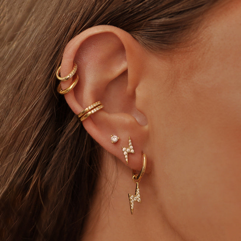The Baby Bolt Earrings features a sparkling CZ pave lighting bolt, set on a dainty gold huggie. Perfect for stacking, pair them with our matching Bolt Stud for the complete look.