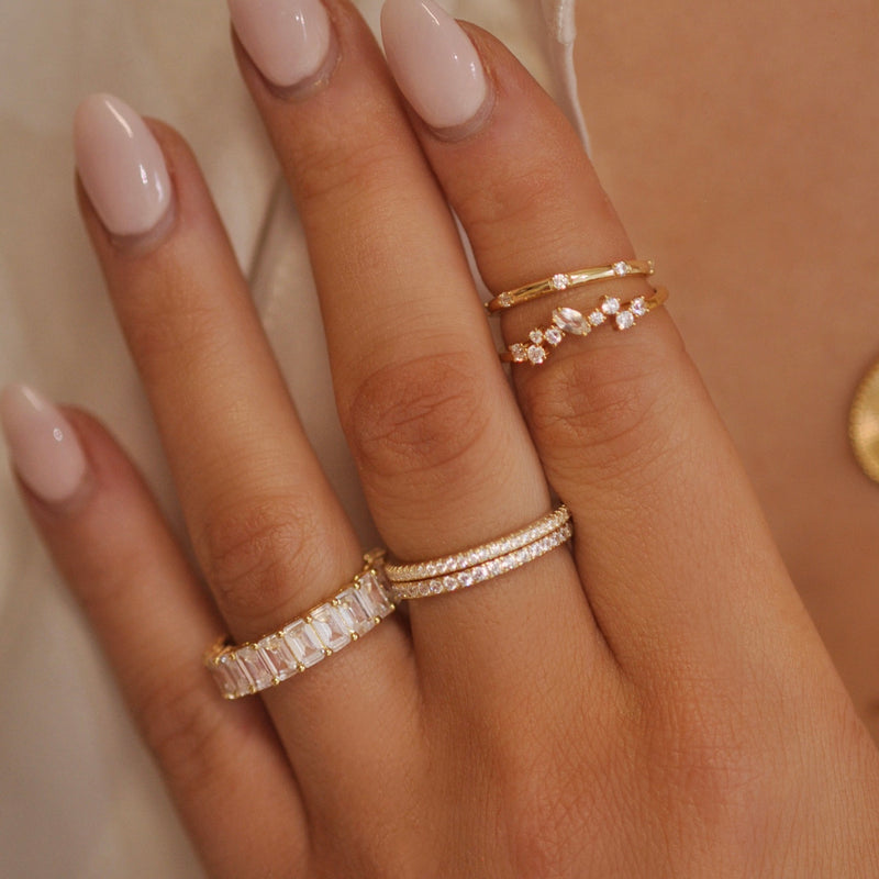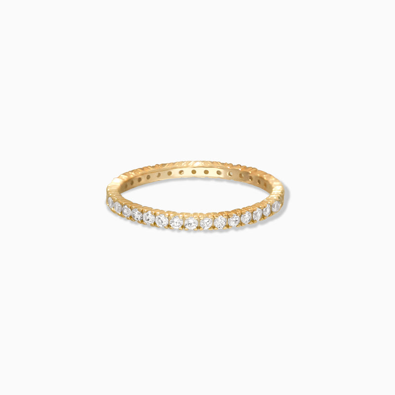 The CZ Eternity Band ring is handcrafted in 18k gold vermeil featuring pave crystals. Pair it with daintier rings to create a basic stack.
