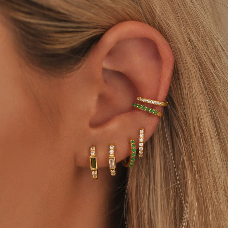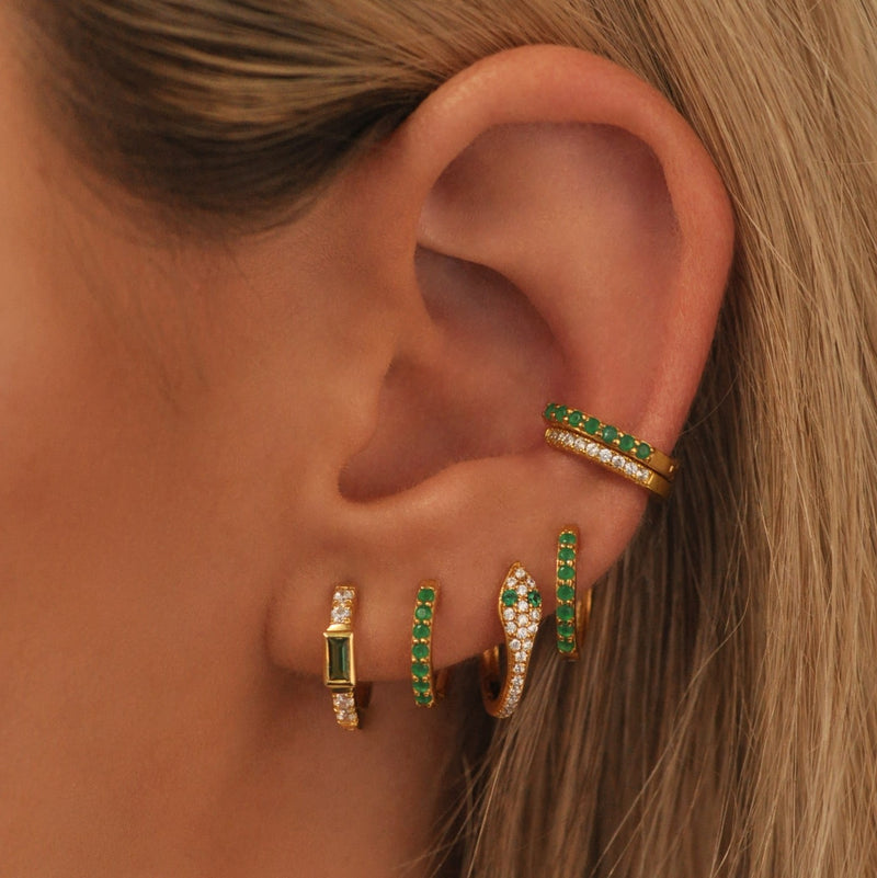 Delicate, classic huggie earrings that you can wear everyday. The Emerald Green huggies are embellished by micro pave green CZ stones, with just the right amount of sparkle. It can be worn alone for an elegant look or stacked to perfection with your favourite earrings.