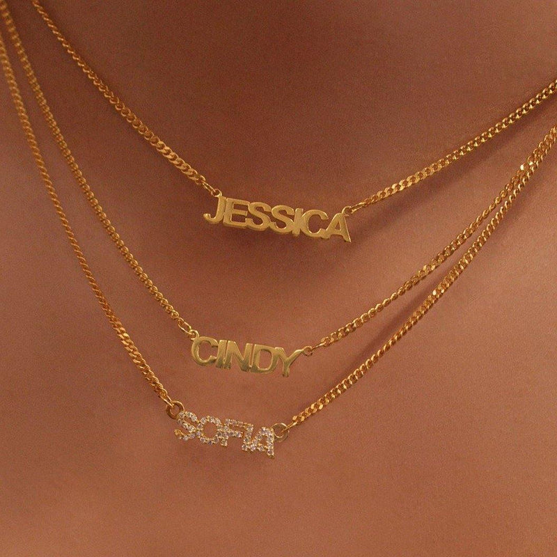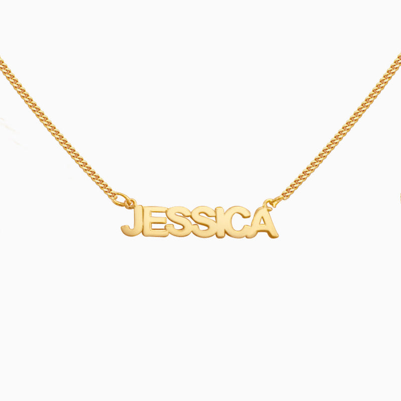 Create your own personalized nameplate choker, featuring a gold uppercase block letter nameplate that sits on a fine curb chain.
