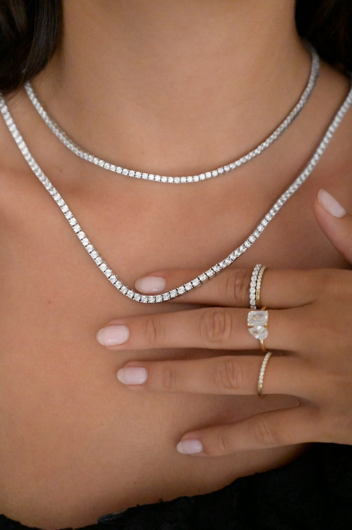Crafted with a beautifully designed strand of clear CZ stones, the Tennis necklaces adds a polished, yet glamorous vibe. Perfect on its own or layered with other pieces.